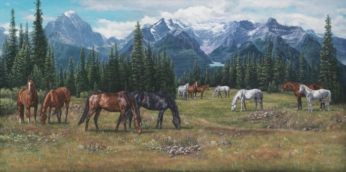 Many backgrounds are based on Western Canada’s landscapes—mountains, foothills, forests, and prairies—often blended with elements from Kim’s travels and personal reference photos.
